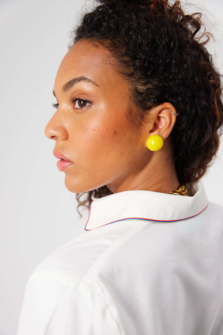 Choose our new Dori shirt for its contemporary cut. Inspired by men’s shirts, our Dori shirt claims to be the perfect masculine top for women. Its loose shoulders and fitted sleeves make it the perfect combination of a boyfriend shirt with feminity. It embraces a straight cut in a cotton fabric that structures slightly the piece. A refined piece that will feed the focus in the strong rainbows pining lines on the collar and the wrists.