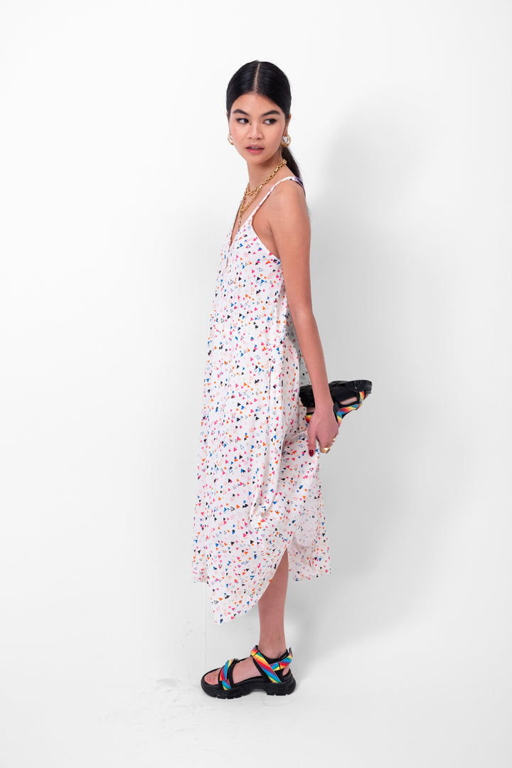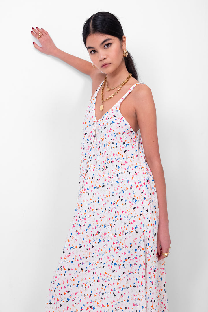 Made in light viscose, the Java dress is an easy-to-wear piece and breathes the candour and festivity of summer by the association of white and a triangular graphic pattern with minimalist looks. The richness of its print fits with the pink and blue striped piping at the back yoke in Zodiac print. It has a V-neckline to enhance your chest.