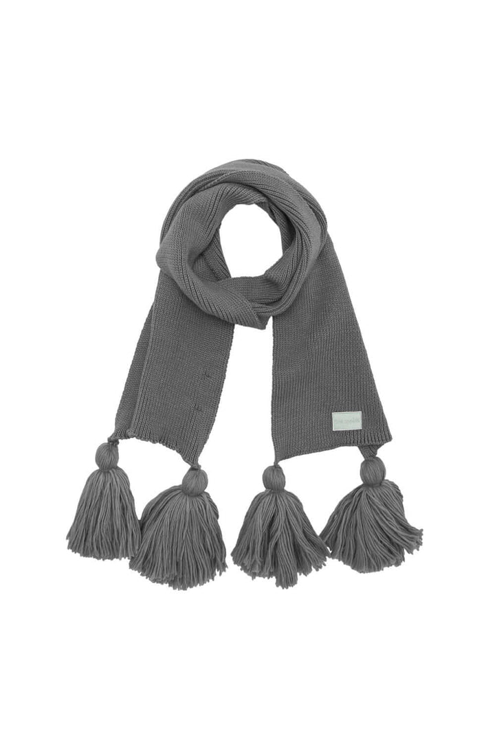 Large scarf in ribbed wool with two pompoms at the end. The front is embroidered with a patch “Bon appetit”.