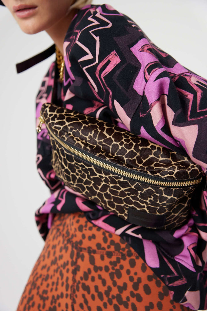 The girafe print is our new print for our iconic fanny pack. It’s a small bag, to wear around the waist, crossbody or on the shoulder. The front is made of a girafe printed hairy leather, while the back and the strap is in a smooth black leather.