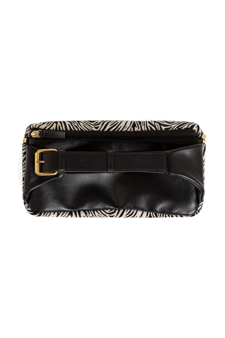 The Zebra print is the new print for te Heimstone iconic fanny pack. It’s a small bag, to wear around the waist, crossbody or on the shoulder. The front is made of a zebra printed hairy leather, while the back and the strap is in a smooth black leather.