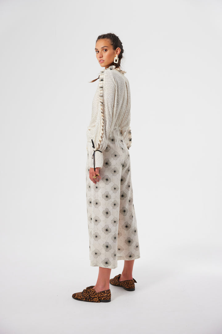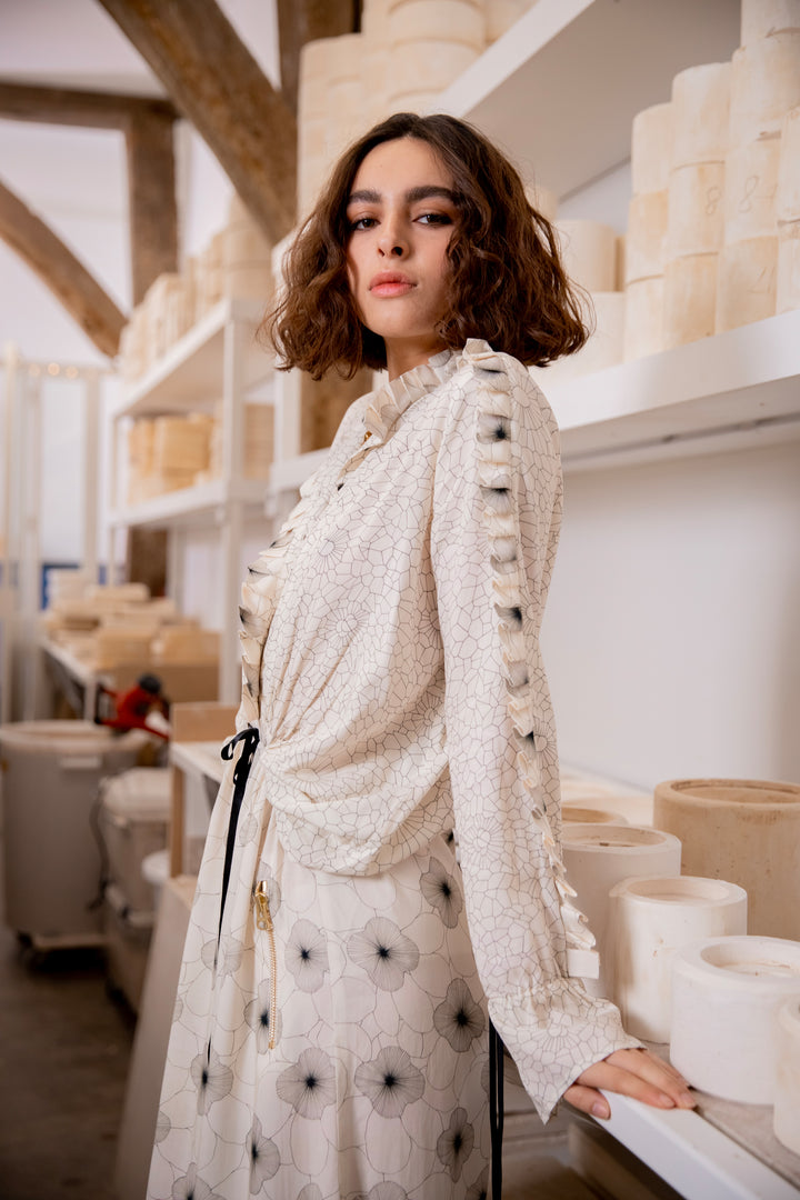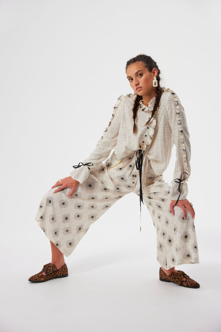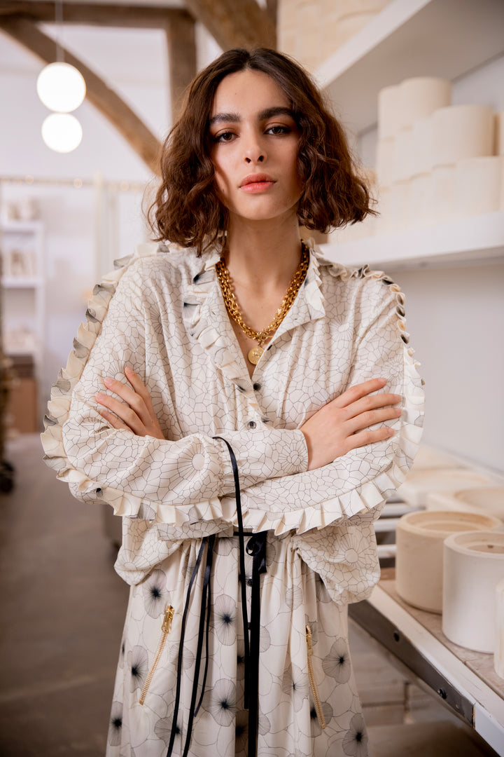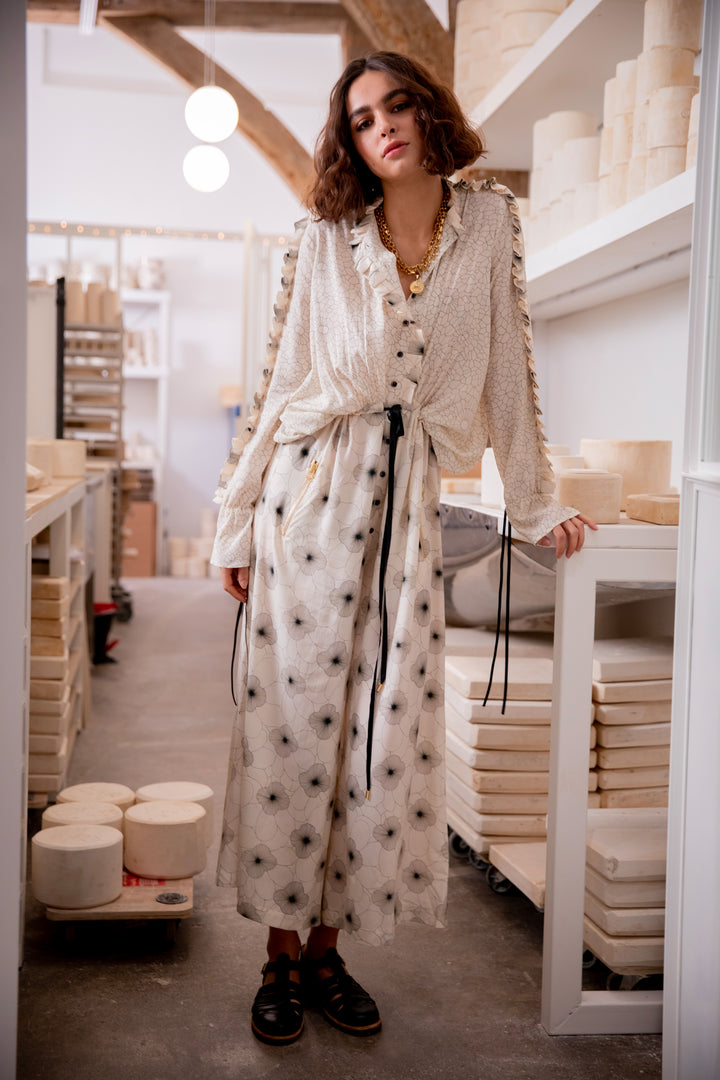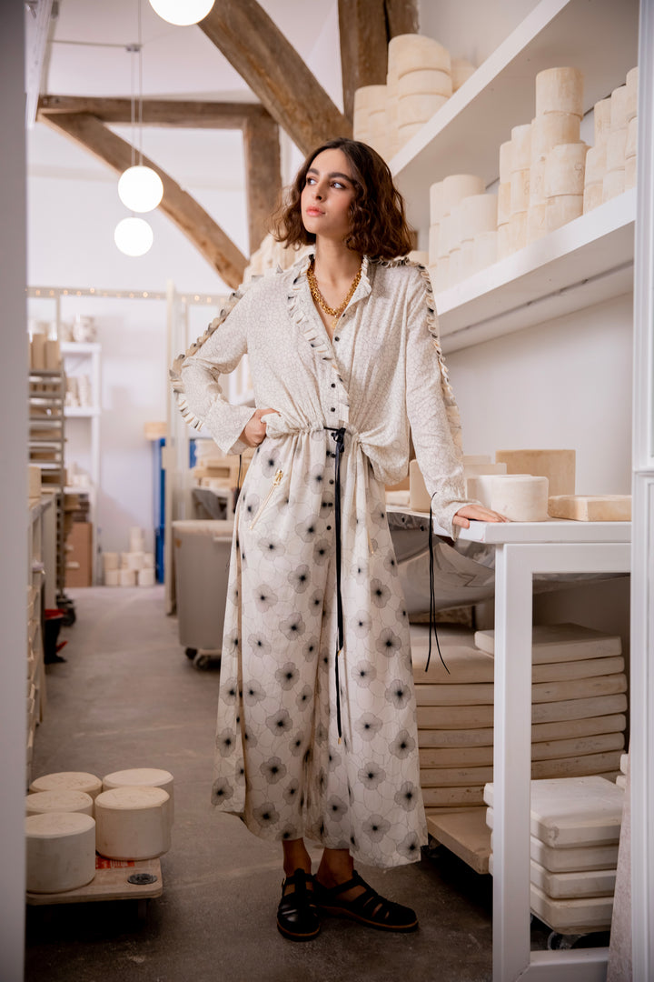 Designed as an extra loose shirt tucked in a culotte-skirt pants, the Gil jumpsuit is a dressed-up and singular piece from the Heimstone’s collection. Its two lines of ruffles bring a chic volume and rhythm to the piece. Sophisticated and suitable to all women with all body types, our Gil jumpsuit Flower print will elevate your wardrobe. The fabric used for this piece is a sumptuous sandstone drapé with a match and mix of the Flower and Dryness print. Very fluid and soft on the skin.