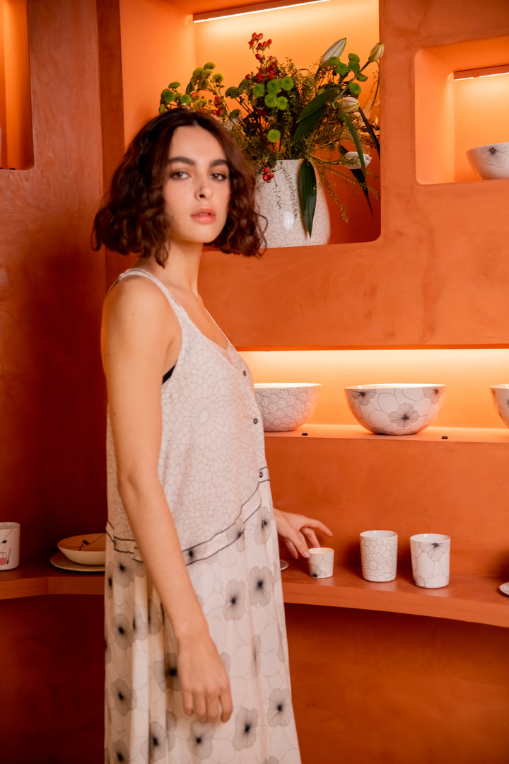 The Java iconic dress is back with a delicate pattern and a flowy fall. Suitable for all body type, it can be worn with ease. The dress is designed in an airy, soft sandstone fabric that echoes summer and vacation. In an impressive Flower print that balances perfectly the complexity of the geometric shapes of the Dryness print, this piece is ideal for summer hottest days.
