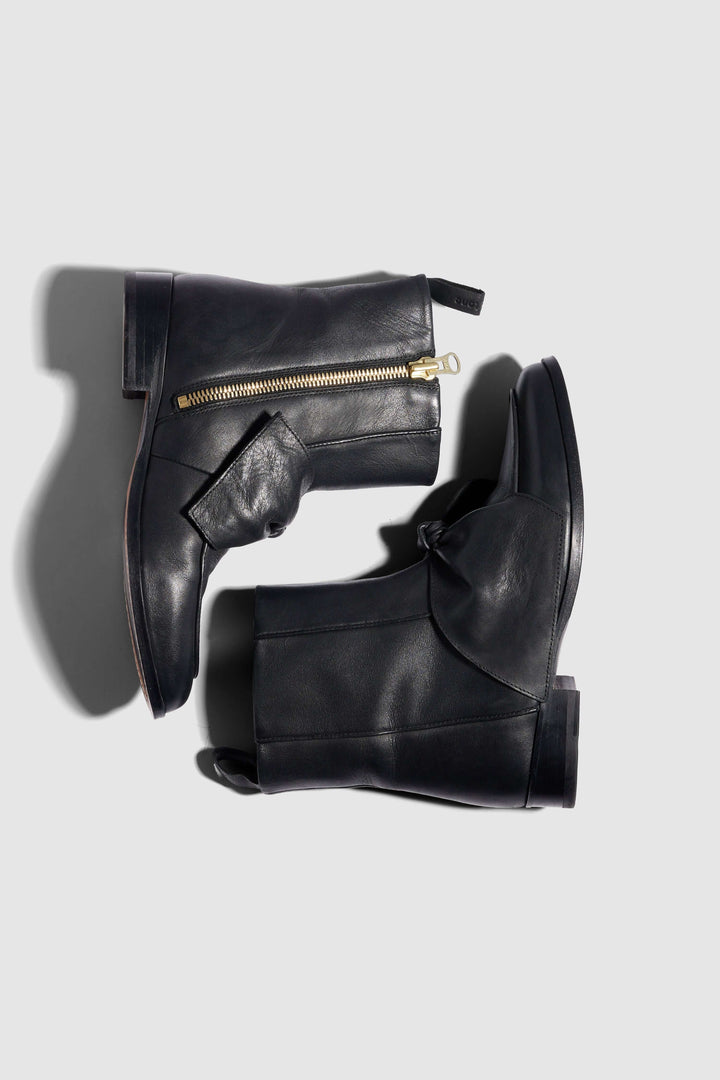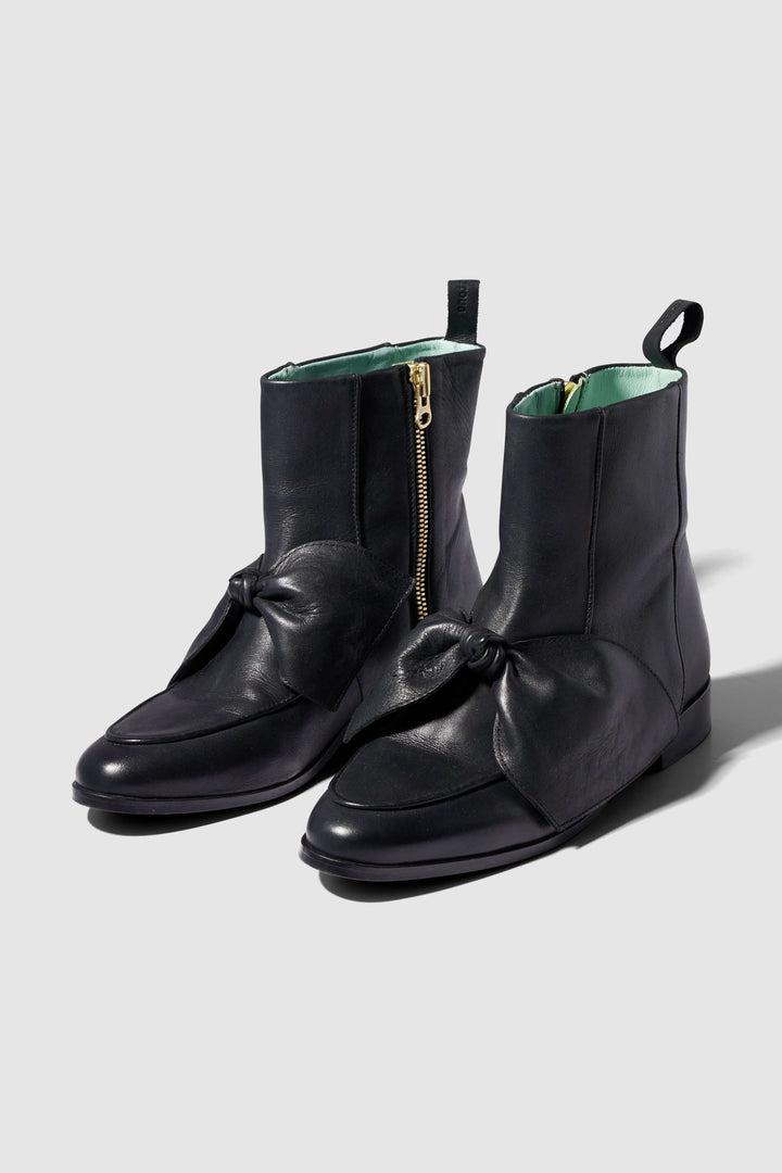 Inspired from our famous BB ballerinas, our new BB boots are a nod to the love of the chic and refined shoes. Made in a slick and thick black leather, these shoes are unique with its asymetrical bow that sublimes the foot and this pointed shape that elongates your walk.
