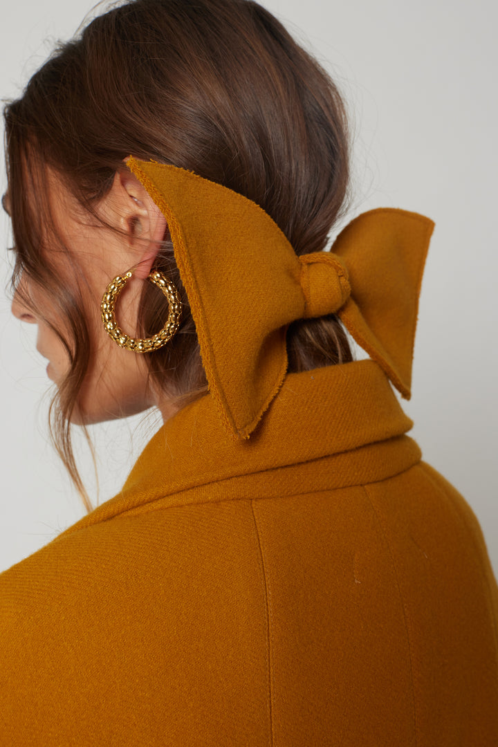 We created our now signature bow hair clip in our beautiful tobacco wool and cashmere. This is an asymetrical bow that will perfect all your looks in every seasons. This accessory is without a doubt The unique accessory to add to your closet. Here it is in its large version.