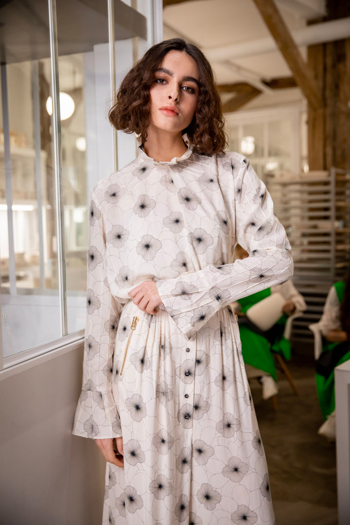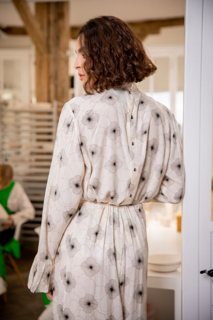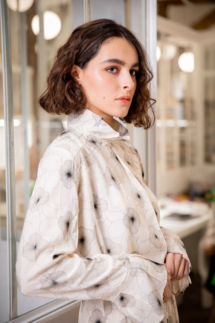Enjoy your summer evenings with our Muse shirt in Flower print. The originality of this model comes from its precious meticulous details, such as its high neck collar, its stitching lines and its slightly smoked cuffs. Designed in Flower print, this piece exalts bucolic softness with its airy fabric in a matte finish, a spot-on choice for those with an affinity for romanticism.