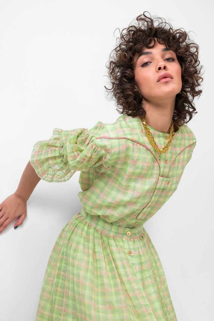 In an airy and structured fabric, the Beausserie shirt features a Vichy pattern with crystalline green, yellow and pink colours. Lined with an ivory glossy polyester, this piece plays with the translucency of the veil organza and the chromatic brightness of the colours. Romantic and feminine as you wish.