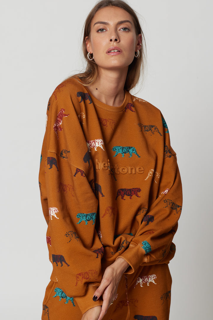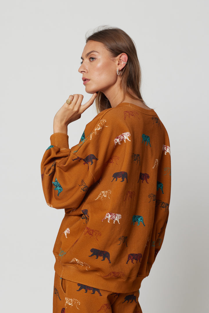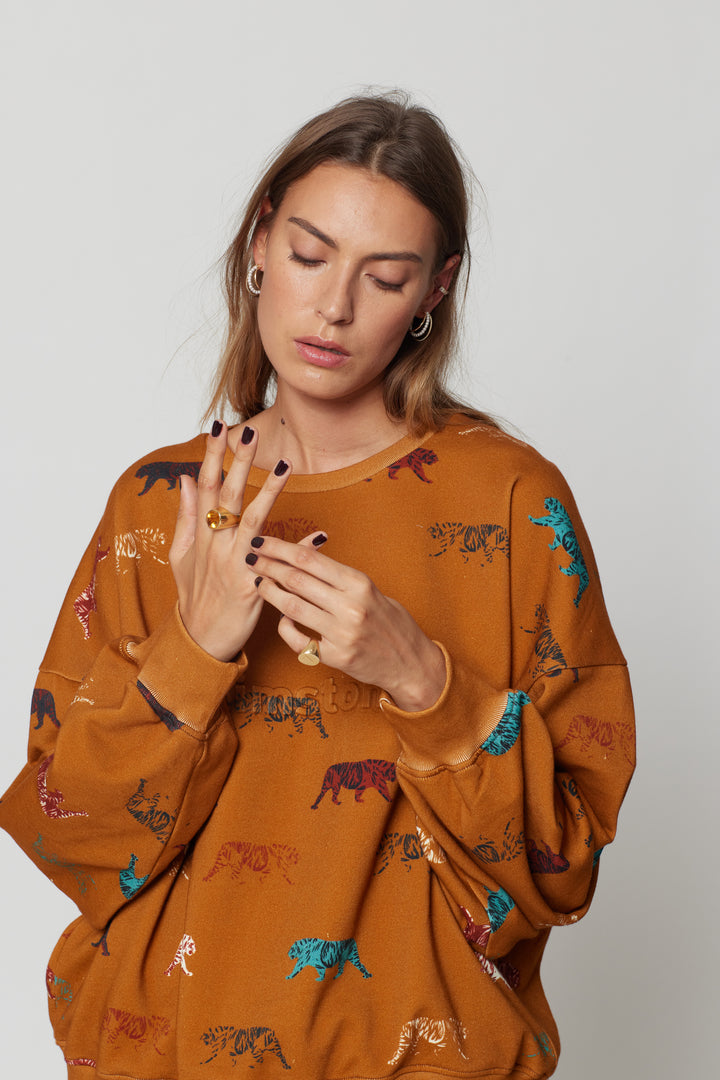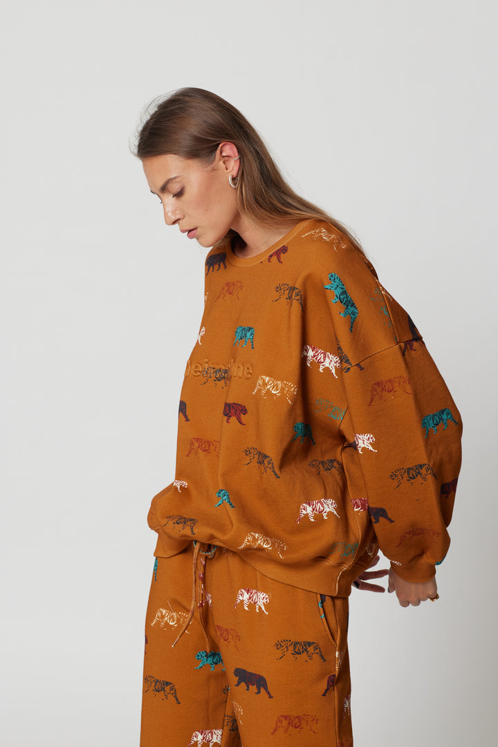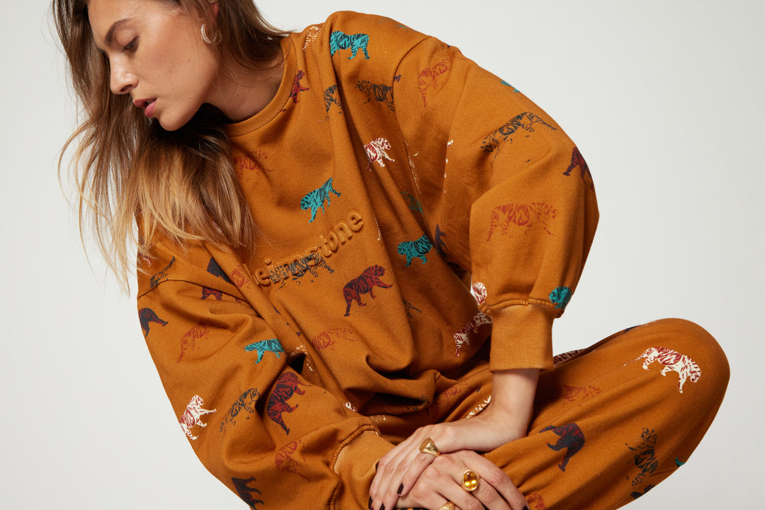 This is our new Harlem Jumper sweat in tiger print in a gorgeous burnt orange. A sporty and urban look to add to our sportwears collection. It is an oversize sweater to wear anytime of the year, after all sports session or even for a walk in the city. Embrace the Heimstone philosophy and allow yourself to be feminine, stylish and corfortable at the same time.