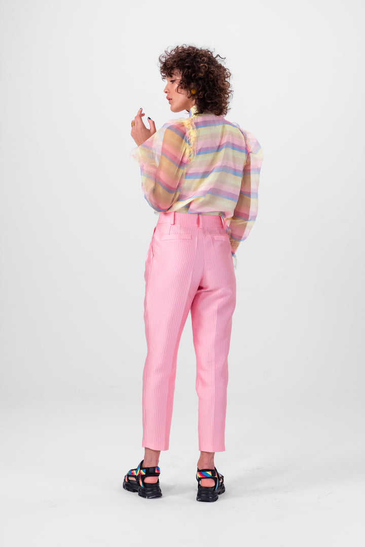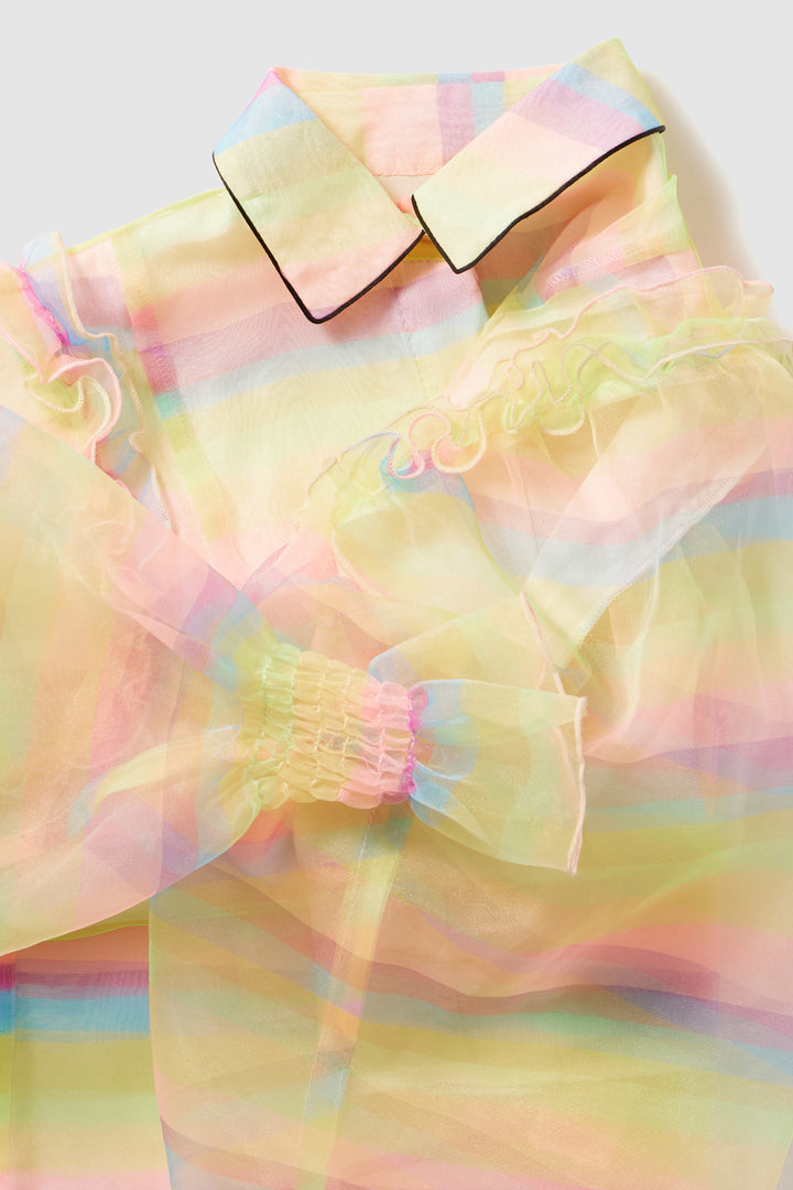 Crafted in a fine pearlescent fabric, the Imogen shirt elegantly features the Martini print and exudes a rainbow palette. Designed in structured and thin organza, the Imogen proudly gathers a masculine collar and delicate cloudy sleeves with smocked cuffs and buzzing ruffles. Sliglty transparent, it dresses up your bust and will add that touch of bright color to your summer outfits.